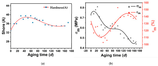 The relationship between surface hardness and time of GAP elastomers under thermally accelerated aging at 70 °C is shown in Figure 9a. With the prolongation of the aging time, the surface hardness of the GAP elastomers showed a trend of rising and then decreasing. The surface hardness did not change much at the late stage of aging. The change in hardness was mainly related to the network structure of the elastomer. The closer the network structure of the elastomer, the greater the hardness, while molecular chain breakage leads to a decrease in hardness. In the early stage of aging, the surface hardness of the GAP elastomer increased, indicating a post-curing reaction. The crosslinking degree of the GAP elastomer increased, forming a more dense network structure [36]. In the late stage of aging, the surface hardness of the GAP elastomer decreased, indicating that degradation of the chain-breaking reaction was dominant in the adhesive system, and the network structure of the macromolecule was destroyed.