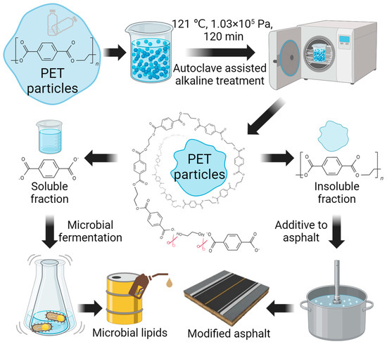 The concept of plastic waste fractionation for multi-stream usage is as shown in Figure 1. The research focuses on PET, which accounts for 12% of total solid waste [45]. We hypothesized that hydrolysis-based treatment method can effectively downsize the PET particles, with a generation of different PET fractions for multi-stream usage based on their forms, achieving PET upcycling in a way that is both efficient and environment-friendly. To investigate the hypothesis, we treated PET materials with water in an alkaline environment at 121 °C for 1 h using a laboratory autoclave instrument and separated the soluble and insoluble fractions after the treatment. The insoluble fraction of hydrolyzed PET was utilized as an effective modifier to improve asphalt binder performance, and the soluble fraction was utilized as a carbon source for microbial fermentation to produce lipids for biodiesel (Figure 1).