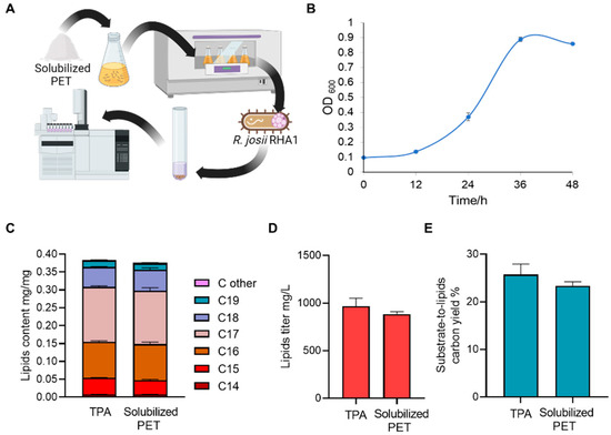 Second, we then tested if the solubilized PET could support the growth of oleaginous bacteria R. jostii RHA1. With the solubilized PET as the sole carbon source, the cell density of R. jostii RHA1 indicated by the optical density at a 600 nm wavelength (OD600) increased from 0.097 ± 0.002 to 0.860 ± 0.006 in 36 h (Figure 2B). This growth rate is comparable to that with typical carbon sources like glucose [50]. The result suggested that the fractionated soluble PET can be used as a substrate to efficiently support RHA1 growth. Lastly, we investigated the lipid production of RHA1 with the solubilized PET as a carbon source. The results showed that the lipid content (lipids/DCW w/w) in RHA reached 37.0 ± 1.5%, which is about the same level as the RHA cells that utilized pure TPA (37.6 ± 0.7%), supporting that the major component of the solubilized PET is TPA (Figure 2C). A component comparison of the lipids from the two carbon sources also showed similar results, revealing that 15–18 carbon fatty acids constituted the predominant components, comprising 83.4 ± 8.1% and 82.5 ± 4.3%, respectively (Figure 2C). These results demonstrated that R. jostii RHA1 utilized the fractionated PET and TPA as the sole carbon source to support their growth and lipid accumulation. To further evaluate the viability of fractionated PET as a feedstock for lipid production, we calculated the lipid titer, which was found to reach 884.2 ± 20.7 mg/L, also comparable to 966.9 ± 67.9 mg/L from TPA and other typical industrial lipid-producing microorganisms [51,52] (Figure 2D). Furthermore, the carbon yield from the solubilized PET and TPA to lipid were 23.4 ± 0.7% and 25.7 ± 0.2%, respectively (Figure 2E). Overall, the results validated our hypothesis that the soluble fraction can be efficiently utilized as a carbon source for biodiesel precursor lipids production. Additionally, our findings supported a previous transcriptomics analysis revealing the existence of the terephthalate degradation pathway in the R. jostii RHA1, and for the first time demonstrated that R. jostii RHA1 can utilize fractionated PET as the sole carbon source for growth and lipid production [48].