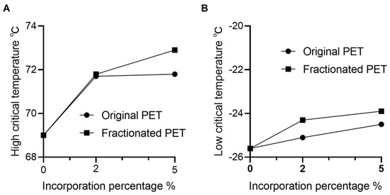 To evaluate the potential of the PET particles as a modifier to enhance high-temperature rutting resistance of asphalt binders, original or modified asphalt binders were subjected to the DSR test to measure the high critical temperature [40] (Figure 4A). The results showed that the addition of PET and fractionated PET at 2% elevated the high critical temperature from 69 °C to 71.7 and 71.8 °C, respectively, signifying a notable enhancement in the performance grade (PG) of the asphalt binder, progressing from PG 64 to PG 70 after the modification with PET particles. The improved high-temperature performance could be attributed to the rising softening point of asphalt binders with PET polymer addition [60].