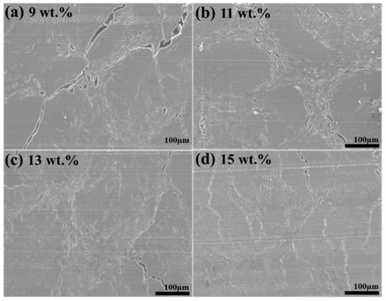 Bamboo has a porous structure, featuring vascular bundles entwined within a matrix of parenchyma cells []. Within these bundles, fiber cells surround the vessel cells. As the bamboo was processed into a scrimber, the porous structure was significantly densified. As illustrated in Figure 1, parenchyma cells were observed to collapse layer by layer along the cross-sectional view. Nevertheless, the sample still retained some cell cavities. The fiber bundles displayed a distinct outline, with the fiber cells largely preserving their original appearance. When the resin content was 11 wt.%, the parenchyma cells were closely connected to the fibrous cells, achieving nearly complete integration. A few parenchyma cells, however, were scattered around the fiber bundles. Elevating the resin content to 13 wt.% resulted in a total amalgamation of parenchyma cells and fiber cells, where larger fiber cells with significant cavities were fully compacted. With a further increase in resin content to 15 wt.%, the cellular structure becomes entirely congested, leaving only isolated pores visible. These changes could be attributed to the “softening” effect of phenolic resin, which prominently reduces the Young’s modulus of woody cell walls []. Therefore, the cell walls exhibited increased compressibility when exposed to phenolic resin. At the low resin content, the cell wall was insufficiently softened, leading to the formation of some cracks. However, as the resin content reached a certain threshold, the cells became more compressible, minimizing crack formation. Therefore, a higher amount of phenolic resin is effective in mitigating cell wall damage during the hot pressing process.