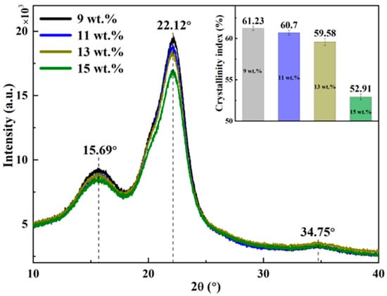 However, the crystallinity index exhibited variability in association with the resin content. Illustrative data presented in the inset reveal that the crystallinity index at a resin content of 9 wt.% was recorded at 61.23%. When more resin was added to the scrimber, the index showed a decreasing tendency. Specifically, when the resin content was elevated to 15 wt.%, the crystallinity index diminished to 52.92%, marking a reduction of approximately 14% from the index at a resin content of 9 wt.%. This decrease could be due to chemical reactions between the hydrogen groups within the crystalline regions of bamboo and the phenolic resin, which likely increase the proportion of amorphous cellulose in the scrimber [].