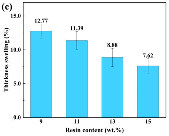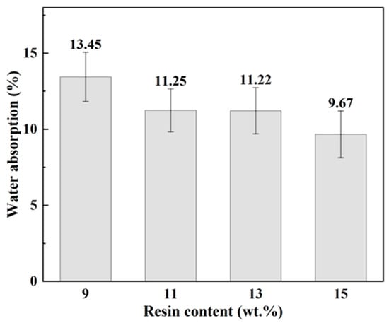 The water absorption of bamboo scrimbers with varying resin contents is illustrated in Figure 3. The water absorption stood at 13.45% with a resin content of 9 wt.%. It exhibited a gradual decrease as the resin content increased. Notably, as the resin content increased to 15 wt.%, the water absorption dropped to 9.67 wt.%, which is 28% less than at a resin content of 9 wt.%. This trend underscores the effectiveness of phenolic resin in reducing water absorption. The resin undergoes curing within the cellular structure of the bamboo, forming a hydrophobic layer that protects the cells from water invasion []. Additionally, the interaction between phenolic resin and bamboo components diminishes the presence of hydrophobic groups within the cells []. Consequently, the utilization of greater amounts of resin in the scrimber improves its water resistance, leading to a reduction in water absorption as the resin content rises. Therefore, augmenting the resin content in bamboo scrimbers results in superior water resistance.
