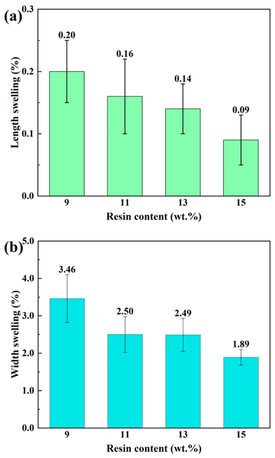 The absorbed water gave rise to dimensional swelling. The dimensional swelling across the length, thickness and width of bamboo scrimbers with varying resin contents is shown in Figure 4. A notable reduction in dimensional swelling is observed with increasing resin content. Specifically, for scrimbers with a resin content of 15 wt.%, the swelling rates were recorded as 0.09% for length, 1.89% for thickness and 7.62% for width. These findings highlight the pivotal role of phenolic resin in enhancing dimensional stability. Beyond its efficacy in curbing water absorption, the resin is deposited extensively within the cell walls, effectively mitigating the swelling response following water ingress [].