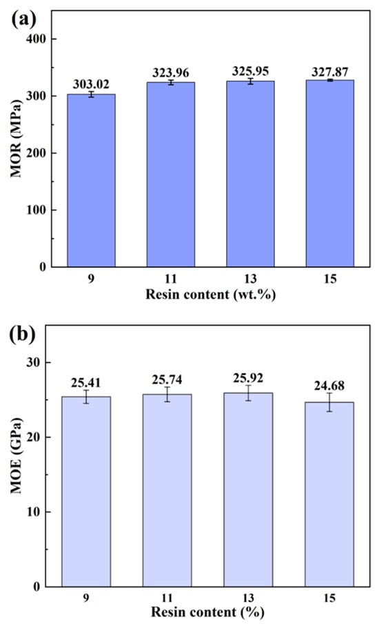 (a) MOR and (b) MOE of bamboo scrimbers with different resin contents.