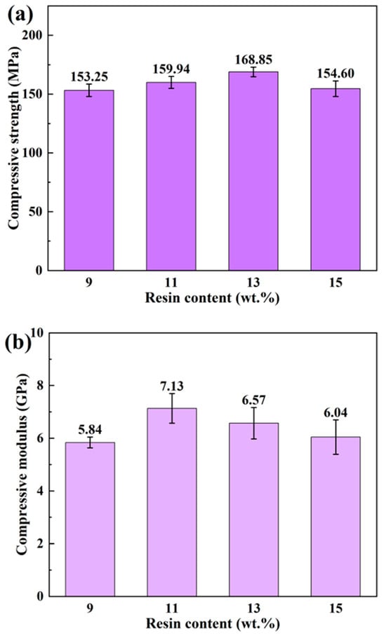 The compressive properties of bamboo scrimbers, as influenced by different resin contents, are depicted in Figure 6. With increasing resin content, the compressive strength of the scrimbers improved, reaching a peak at 168.85 MPa at a resin content of 13 wt.% before it began to decline. A similar trend was found in the compressive modulus, which ascended to a zenith of 7.13 GPa at a resin content of 11 wt.%, then decreased as the resin content continued to rise. These trends suggest a correlation with the bonding properties of bamboo fiber bundles. At the adhesive interface of bamboo fibers and phenolic resin, mechanical bonding mechanisms such as hooking, anchoring and stapling play a crucial role []. More resin added to the scrimber typically improves the bonding quality and, by extension, its compressive properties. However, beyond a certain threshold, excessive resin can compromise the bonding efficacy, leading to a decrease in compressive properties. This observation is corroborated by the outcomes of the short-beam shearing tests.