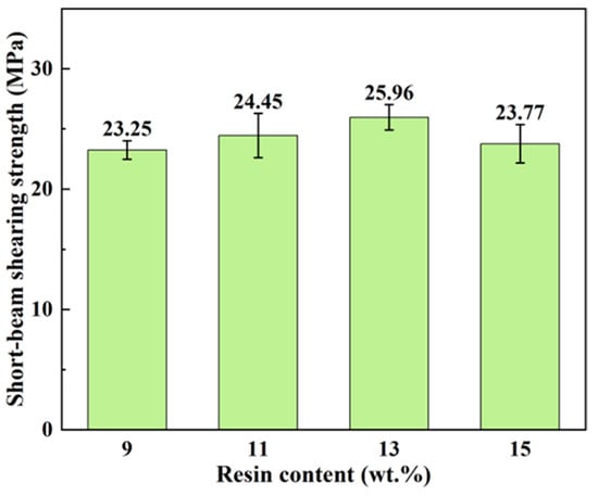 Figure 7 presents the variations in short-beam shearing strength among bamboo scrimbers with different levels of resin content. Similar to the trends observed in compressive strength, the shearing strength initially increased before declining as more resin was used in the scrimber. The maximum strength, amounting to 22.37 MPa, occurred at a resin content of 13 wt.%. The short-beam shearing strength serves as an indicator of the bonding quality of laminated woody panels []. The higher strength indicates a better bonding quality between the bamboo fibers and phenolic resin. What is more, more resin infiltrating into cell walls further strengthens the cells, leading to a notable improvement in shearing strength. However, the decrease in shearing strength as the resin content exceeded 13 wt.% suggested that excessive resin was detrimental to bonding bamboo bundles. Therefore, an appropriate resin content is good for optimizing the compressive and shearing properties of high-density bamboo scrimbers.