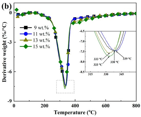 The peak temperature was around 335 °C. According to the report by Yang et al. [], hemicellulose decomposition is noted within a range of 220 °C to 315 °C, cellulose pyrolysis occurs between 315 and 400 °C, and lignin undergoes pyrolysis across a broad spectrum of temperatures from 150 up to 800 °C. This clarifies that the pronounced peak observed in the bamboo scrimbers’ thermogram is primarily due to cellulose pyrolysis, while the shoulder peak around 330 °C is believed to result from the overlapping decomposition of both hemicellulose and lignin. Interestingly, the pyrolysis peaks of the scrimber shift to low temperatures with an increase in resin content, suggesting that phenolic resin contributes to a decrease in the decomposition temperatures of bamboo components. Furthermore, the data reveal that a higher resin content leads to a lower residual yield at 800 °C, which implies that adding more resin diminishes the thermal stability of the bamboo scrimbers.