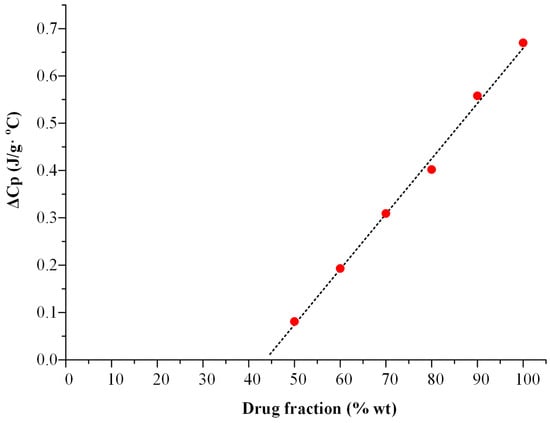 The ΔCp extrapolation for the OLN-Syloid 244 FP system is depicted in Figure 1. For this system, the MLC (the x-intercept of the extrapolated function) was found to be 43.8 wt%. Regarding the ternary systems, the PFC was calculated using Equation (1) and determined to be 66.7%.