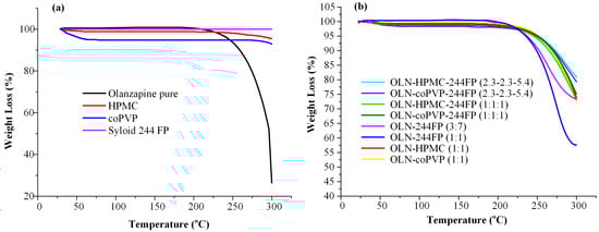 However, any loading method based on melting necessitates the thermal stability of the drug and, generally, the individual components of the systems during processing at elevated temperatures. In this context, the thermal stability profile of the raw materials was examined through TGA. As indicated by the results presented in Figure 2a, OLN remains stable up to ~210 °C, while the thermal degradation of HPMC initiates at approximately 260 °C. Syloid 244 FP exhibits thermal stability up to 300 °C, while coPVP shows only a slight weight loss (∼4.0% w/w) at temperatures below 100 °C, indicative of residual moisture water loss. Regarding the PMs of the binary and ternary OLN systems that were investigated, the results (Figure 2b) indicated that the binary OLN-Syloid 244 FP systems exhibited a similar thermal degradation path to pure OLN for both weight ratios studied.