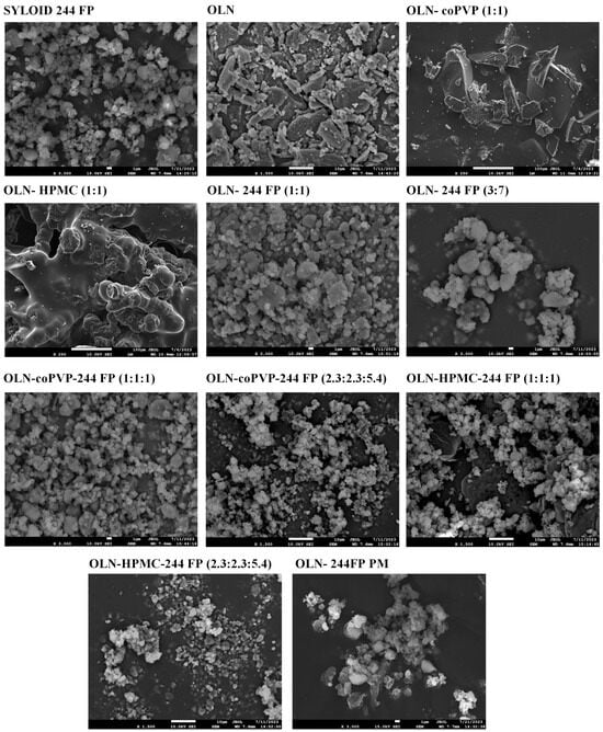 The morphology of the prepared OLN ASDs was evaluated via SEM, and the images collected are presented in Figure 3. Syloid 244 FP appears to consist of very fine, irregularly shaped, and loosely aggregated particles, while pure OLN can be observed as small to large irregularly sized and shaped crystals with a tendency to self-agglomerate. These findings are consistent with references to previously published studies [,]. The binary OLN ASDs with coPVP or HPMC exhibit a uniformly compact shape without the appearance of porosity. OLN ASDs containing Syloid 244 FP, whether in binary or ternary formulations, display a comparable morphology, appearing as aggregated particles.