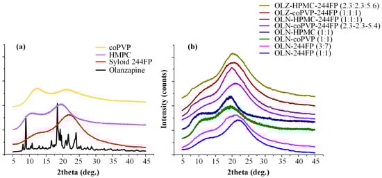 Powder X-ray diffractograms for the raw materials (a) and prepared binary and ternary OLN ASDs (b).