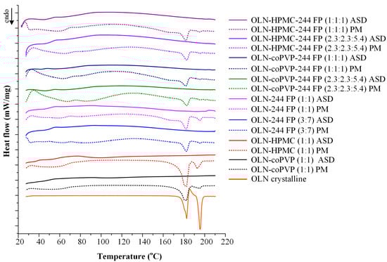 DSC thermograms of crystalline pure OLN, the developed ASDs, and their corresponding PMs.