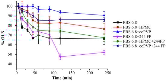 Initially, an incremental introduction of approximately 5 mL of a 10% w/v OLN solution in methanol into a dissolution medium consisting of 500 mL of the chosen buffer was conducted, with or without the incorporation of a polymer and Syloid 244 FP. In cases where the buffer included a polymer, the polymer concentration was set at 10 mg/mL. The concentration of Syloid 244 FP in PBS 6.8 was exactly the same in cases where it was introduced into the system, either alone or in combination with a polymer.