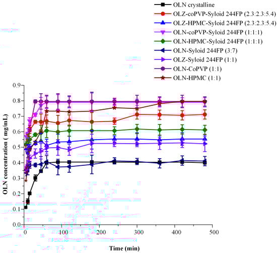 In Figure 7, the in vitro dissolution profiles of binary and ternary OLN ASDs are presented in comparison with the corresponding profile of pure crystalline OLN.