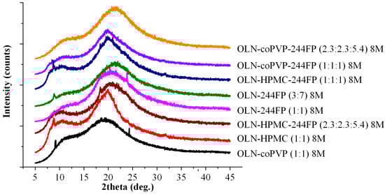 pXRD diffractograms of binary and ternary OLN ASDs after 8 months of storage (8 M).