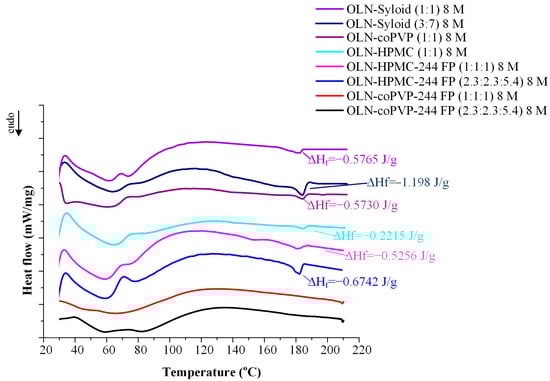 Figure 9 depicts DSC thermograms of the ASDs following storage. As evident from the graph, the only systems not exhibiting the OLN melting peak are the ternary ASDs: OLN-coPVP-244FP. This finding confirms the results of the pXRD analysis, where these ternary systems were the only ones to remain amorphous after an 8-month storage period. The enhanced physical stability of these systems could be attributed to the presence of stronger molecular interactions between the components, resulting in the inhibition of the crystallization of the API. However, it should be noted that the incorporation of HPMC into the system resulted in lower ΔHf values compared with the binary OLN-244FP ASDs. Nonetheless, this carrier was not sufficient for fully inhibiting the crystallization of OLN, as observed with the coPVP-Sylloid 244 FP carrier combination. Furthermore, it should be emphasized at this point that the broad peaks observed in a temperature range of 40–100 °C can be attributed to the water absorbed by the samples during their storage at elevated humidity levels (60 ± 5% RH).
