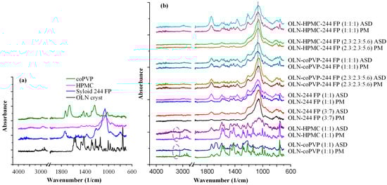 Considering that the development of molecular interactions between the drug and the matrices/carriers in the ASDs stands as a fundamental stabilization mechanism for this amorphous API, their presence in the developed OLN ASDs was investigated through ATR-FTIR spectroscopy in an attempt to elucidate the superior performance observed in the ternary OLN-coPVP-244 FP systems.