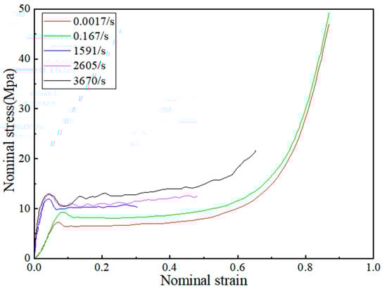 Stress-strain curves of PVC foam (H250) under uniaxial compression at different strain rates.