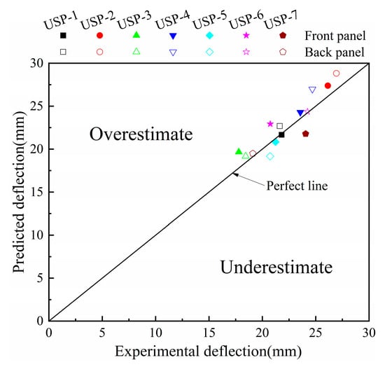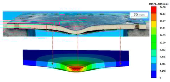 The validity of the finite element model and material parameters of PVC foam has been confirmed through comparison with the experimental data from Zhou [24]. The simulation considers all conditions influenced by a 55g TNT explosion at a distance of 100 mm, as detailed in Table 2. The deflection predictions of the points in the panels were compared by using the experimental measurements, as shown in Figure 2 [24]. There was a good agreement between the numerical simulation results and the experimental results, with the points in the figures close to a perfectly matched line. In addition, a typical sandwich panel USP-3 was selected to verify the correlation between the numerical simulation and the experiment in terms of deformation/failure modes, as shown in Figure 3. It can be observed that the numerical simulation shows a significant local large deformation in the front panel and an overall deformation in the back panel. In addition, the compression and bending deformation of the core layer in the numerical simulation and the delamination failure between the core layer and the panel were also consistent with the experimental results. In summary, most of the details of the deformation/failure modes observed in the experiment are captured by the numerical simulation results.