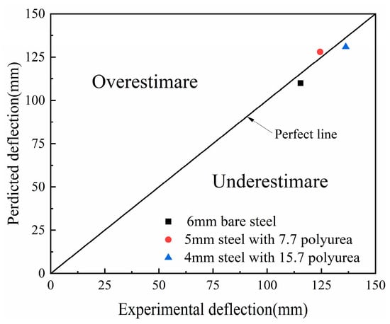 The numerical model of polyurea is compared and validated with the Auckland’s experiment [37], including three working conditions: (1) a 6 mm thick bare steel panel; (2) a 5 mm thick steel panel coated with thick 7.7 mm polyurea; (3) a 4 mm thick steel panel coated with 15.7 mm thick polyurea. The steel panels used in the model are Bluescope XLERPLATE 350 (Bluescope Steel. Bluescope steel 350 Xlerplate steel datasheet. Port Kembla: Bluescope Steel Limited, Port Kembla, Australia; 2009.®), and the explosive is Pentolite. The numerical simulation results were compared with the experimental results of Ackland, as shown in Figure 5. The numerical simulation accurately predicted the deformation of bare steel panels and polyurea-coated steel panel under air blast loading. Furthermore, the numerical model and material parameters reflected the mechanical properties of the steel panel and polyurea.