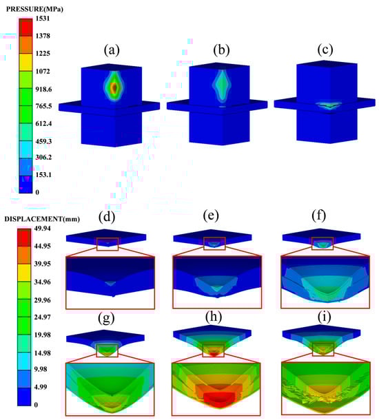 Typical processes of explosion product-structure interaction and panel deformation: (a) t = 9.3 μs; (b) t = 11.5 μs; (c) t = 20 μs; (d) t = 25 μs; (e) t = 35 μs; (f) t = 52.5 μs; (g) t = 120 μs; (h) t = 500 μs; (i) t = 1500 μs.