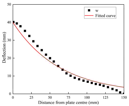 In the formula, represents the deflection of each point on the x-axis of the front panel, represents the deflection of the midpoint of the panel, represents the side length of the board, and is the parameter that requires fitting. The fitting results for the front panel of DP-1 is shown in Figure 8, with a fitted R value of 0.968. The fitted values for the sandwich panels with different arrangement strategies are provided in Table 5.