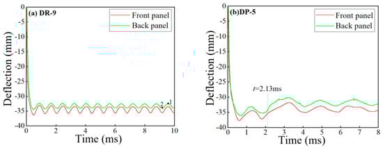 The deflection of the DR-1 front panel was 7.04% higher than that of the DR-9 front panel. The thicker polyurea support provided to the front panel restricted its movement, but also reduced the degree of localization. And this results in overall large deformation and greater deflection in the DR-1 panel. The deflection of the DP-1 front panel was 7.54% higher than that of the DR-1 panel. The appropriate thickness of the PVC foam core allowed for greater movement of the front panel, and increased the deflection of the DP-1 panel. Due to the support of the PVC foam, the DP-2, DP-5, and DR-9 front panels had a stronger degree of localization and smaller deflections.
