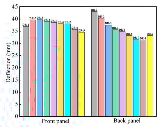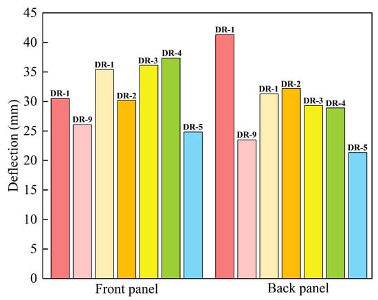 The average of the peak deflections at the midpoint of the panels was taken as the final deflection, as shown in Figure 18, for various mass ratios in sandwich panels. As the mass ratio of PVC foam increases, the deflection at the midpoint of the front panel initially increases and then decreases. The DR-3 front panel had the highest deflection at its midpoint. When the thickness of PVC foam was less than 8 mm, its buffering effect effectively reduced the support force on the front panel from the core layer and led to an increase in deflection at the midpoint of the front panel. However, the deflection at the midpoint of the DR-3 front panel was 3.2% more than DR-2. It indicated that the buffering effect of 8 mm PVC foam was only slightly improved compared to 4 mm PVC foam, and thicker PVC foam provided stronger bending resistance that limited the displacement of the front panel. When the thickness of PVC foam exceeded 8 mm, the front panel exhibited a stronger localization. At this point, the stronger bending resistance of thicker PVC foam became the dominant factor and led to a decrease in deflection at the midpoint of the front panel as the thickness of PVC foam increased.