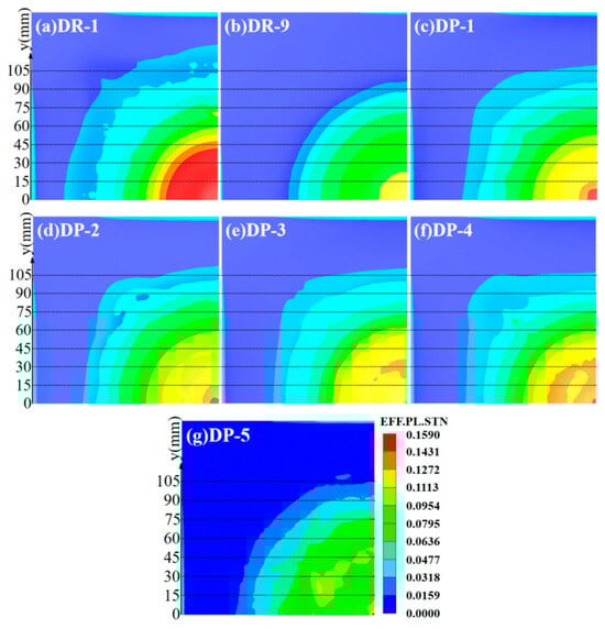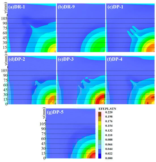 Effective plastic strain of back panels at t = 1000 μs: (a) DR-1; (b) DR-9; (c) DP-1; (d) DP-2; (e) DP-3; (f) DP-4; (g) DP-5.