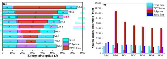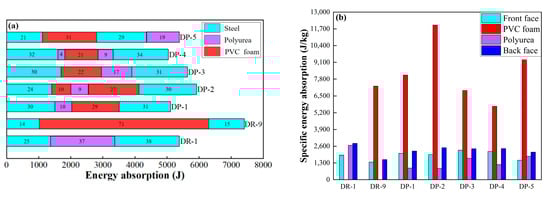The relative energy absorption characteristics of the components of the sandwich panel are illustrated by using a bar graph, as shown in Figure 15b. The specific energy absorption capability of PVC foam per unit mass was higher than that of 304L stainless steel and polyurea. DP-2 exhibited the strongest energy absorption capability for PVC foam, and cutting PVC foam into two sections and adding a polyurea interplay can enhance its energy absorption capability. Its specific energy absorption is 64.7% higher than that of the reference panel DR-9. When PVC foam was adjacent to both the front and back panels (DP-5), or when it was adjacent to the back panel only (DP-1), it experienced more effective compression. On the other hand, the presence of a polyurea core layer between PVC foam and the back panel (DP-3), or the presence of a polyurea core layer between PVC foam and both the front and back panels (DP-4), reduced the compression of PVC foam. Polyurea adjacent to the back panel also exhibited stronger energy absorption capability (DR-1 and DP-3). However, polyurea is not an ideal energy-absorbing material, and the specific energy absorption of polyurea core layers in DP-1 to DP-4 was lower than that of the front and back panels.