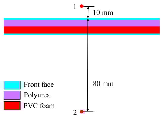 The blast resistance of sandwich panels is reflected in their structural strength, and in their capability to attenuate shock waves. Figure 16 shows the placement of two measurement points for reflecting overpressure (Point 1) at 10 mm from the front surface and attenuated overpressure (Point 2) at 80 mm behind the panel.