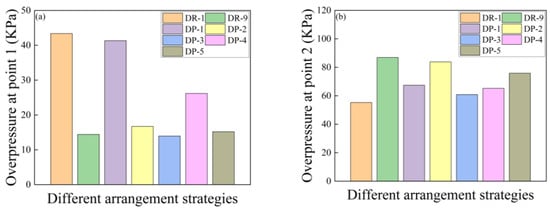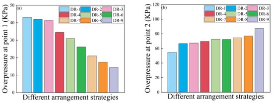 Overpressure peaks at measurement points of sandwich panels with different arrangement strategies: (a) Reflected overpressure peaks at point 1; (b) Overpressure peaks at point 2.