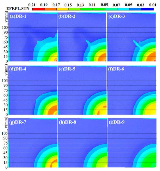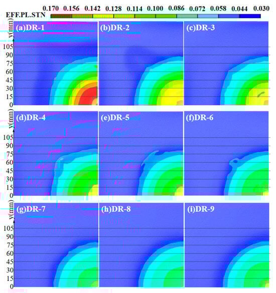 Effective plastic strain of front panels: (a) DR-1; (b) DR-2; (c) DR-3; (d) DR-4; (e) DR-5; (f) DR-6; (g) DR-7; (h) DR-8; (i) DR-9.