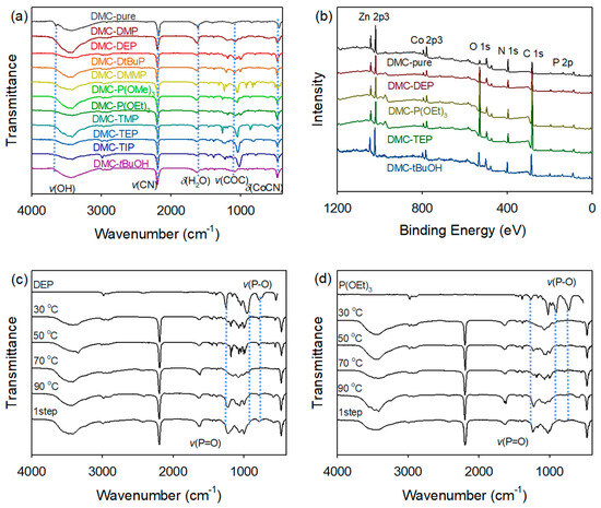 Characterization of various DMC-OPCs catalysts using FTIR (a) and XPS (b) spectra. FTIR spectra of DMC-DEP (c) and DMC-P(OEt)3 (d) catalysts prepared at different temperatures.