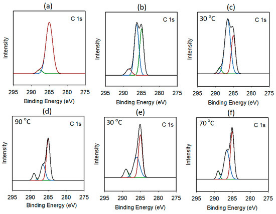 Expanded C 1s XPS spectra: (a) DMC-pure, (b) DMC-DMMP, (c,d) DMC-DEP prepared at 30 and 90 °C, respectively, and (e,f) DMC-P(OEt)3 prepared at 30 and 70 °C, respectively.