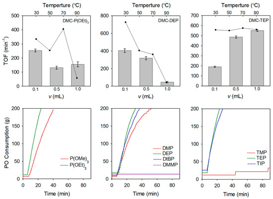A series of DMC catalysts incorporating different OPC CAs were initially investigated for the ROP of PO. Various initiator systems were employed during the reactions, and the consumption of PO was monitored over time. The optimal conditions for the DMC catalyst preparation were determined by adjusting the amount of CA and the reaction temperature. Figure 4 presents a comprehensive overview of the turnover frequency (TOF) values, varying amounts of CA and temperatures, and the PO polymerization curves obtained for different types of CA. The DMC-P(OEt)3, DMC-DEP, and DMC-TEP catalysts were prepared by conducting experiments with different amounts of CA and reaction temperatures to optimize the synthesis process. The manufacturing conditions for each catalyst are listed in Supplementary Table S1.