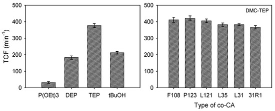 Turnover Frequency (min−1) of PO ring-opening polymerization: Comparison between DMC catalyst without co-CA and DMC-TEP catalyst prepared with different Types of co-CA.