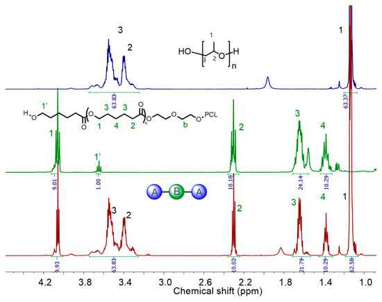 1H NMR spectra (400 MHz, CDCl3) of PPG, PCL and PPG-PCL-PPG block copolymer (BCP-1). A: Polypropylene glycol (PPG), B: Polycaprolactone (PCL).