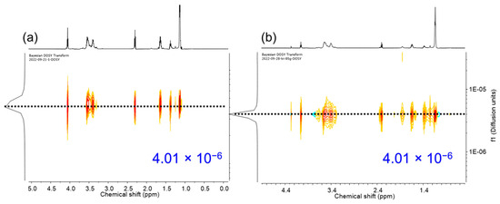 The synthesis of PPG-PCL-PPG and PPG-PTMG-PPG triblock copolymers were conducted in a 500-mL stainless-steel reactor using PCLs and PTMGs (F = 2, MW = 1400–2000 g mol−1) as macroinitiators and DMC-DEP catalyst. The α,ω-hydroxyl-functionalized PCLs were obtained by ROP of CL using EG initiator and DMC-DEP catalyst (Supplementary Figure S42). The resultant copolymers were intensively characterized by both 1H and DOSY NMR analysis (Figure 8 and Figure 9 and Supplementary Figures S43–S45).