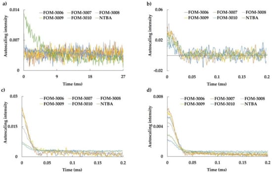 T2 relaxation curves of each single-monomer polymer. (a) CPMG, (b) DQ, (c) MSE, and (d) SE. The blue, orange, gray, yellow, and light and dark green lines represent FOM-3006, FOM-3007, FOM-3008, FOM-3009, FOM-3010, and NTBA, respectively.