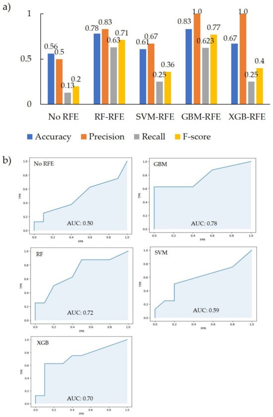 Performance of each model. (a) Accuracy, Precision, Recall, and F-score of each RFE; (b) ROC and AUC score of each RFE.