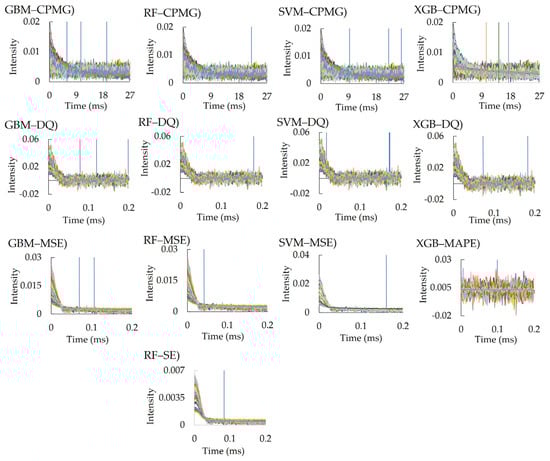 The important factors extracted differed for each model (Figure 5). As a feature of RDKit, fr_unbrch_alkane was the top selected feature in all RFE models. For the TD-NMR sequence, several time points of the CPMG, double quantum (DQ) filter, MSE, MAPE, and SE sequences were selected, but most of them were after the intermediate region where the slope of the transition curve becomes gentle (Figure 6). The important factors extracted differed for each model (Figure 5 and Figure 6).