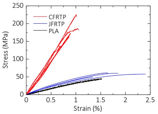 Matsuzaki et al. [36] also utilized the same method of in-nozzle impregnation to produce Filled and Reinforced Thermoplastics (FRTP). In their study, they separately fed the thermoplastic resin (polylactic acid (PLA) resin) and reinforcements (carbon fiber tow (CFRTP) and twisted jute fiber yarn (JFRTP)) into the printer head. The reinforcing fibers were preheated using a nichrome wire before entering the nozzle, while the matrix material was melted by a heater within the printer head. The resulting reinforced composite was then deposited layer-by-layer on the hot build platform (80 °C) using a single nozzle. Within the nozzle, the matrix material filament and both reinforcing fibers were heated to 210 °C. The feeding rate and fraction volume for CFRTP were 100 mm/s and 6.6%, respectively, while for JFRTP, they were 60 mm/s and 6.1%. Figure 5 provides a comparison of the tensile strength between pure FRTP, CFRTP, and JFRTP [36].