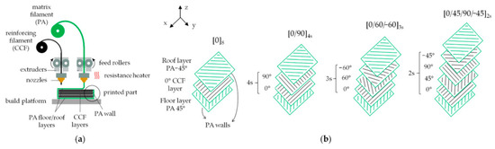 - Matsuzaki, R.; Ueda, M.; Namiki, M.; Jeong, T.K.; Asahara, H.; Horiguchi, K.; Nakamura, T.; Todoroki, A.; Hirano, Y. Three-dimensional printing of continuous-fiber composites by in-nozzle impregnation. Sci. Rep. 2016, 6, 23058. [Google Scholar] [CrossRef] [PubMed]