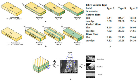 Regarding the matrix, two commonly used materials in reinforced composites as matrixes are thermoplastics and thermoset (thermosetting polymers). The former, thermoplastic, also known as thermosoft plastic, is a pliable plastic polymer that melts quickly at elevated temperatures and solidifies during the cooling process. The most widely used thermoplastics are PLA [53,54], ABS [37], polycarbonate (PC) [55,56], polypropylene (PP) [57], polyamide (PA) [58,59] (e.g., Nylon [60,61,62], polystyrene (PS), polyphenyl sulfone (PPSU), polyetheretherketone (PEEK) [63], polyaryletherketone (PAEK), and polyetherimide (PEI). Thermosets, conversely, are obtained by the irreversible hardening (curing) process of a soft solid or viscous liquid prepolymer (resin) [64]. Curing is induced by heat or suitable radiation and may be boosted by high pressure or the addition of a catalyst. Photo-curable resins, acrylic-based resins, and cyanate ether are among the commonly used thermosetting polymers [18,65,66].