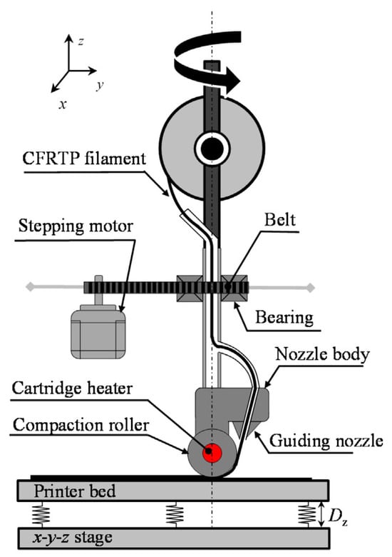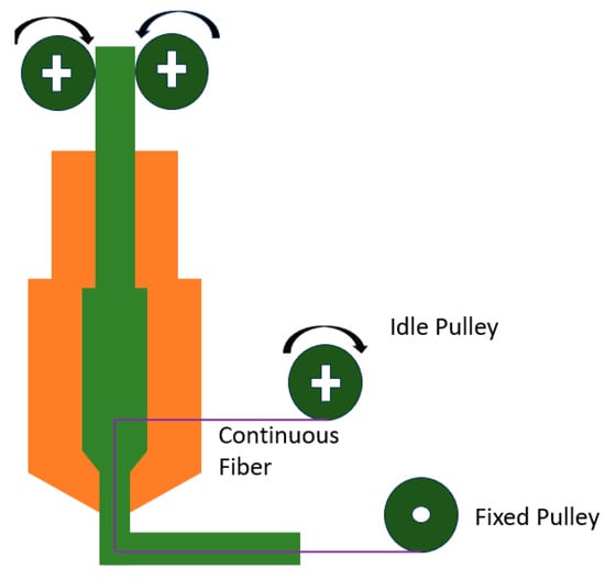 However, a drawback of this method is the poor bonding between the layers (fiber and matrix) due to the short dwell time, which results in a weakened strength of the printed part. The quick dwell time in the nozzle leads to inadequate polymer infusion into the fiber bundles, resulting in increased porosity and weaker mechanical properties. Consequently, this mechanism produces a subpar fiber-matrix interface due to low compaction during the printing process [18,28].