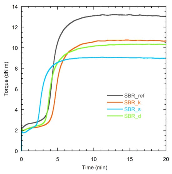 The uncured (cured) compounds are denoted as SBR_ref (vSBR_ref), SBR_k (vSBR_k), SBR_d (vSBR_d), and SBR_s (vSBR_s), representing the compound without resin, and those containing Kristalex, Dertoline, and SDM, respectively.
