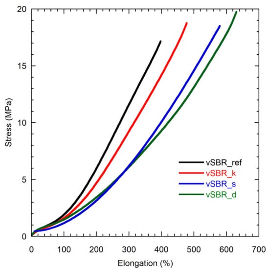 Information on the effect of the different kinds of resins on the tensile properties of the vulcanized SBR compounds was obtained from the stress–strain experiments (Figure 3 and Table S1). In all cases, the amount of stress to achieve a certain degree of deformation is lower in the presence of resin, as highlighted by the values of the modulus at 300% elongation (M300). Furthermore, vSBR_d and vSBR_s exhibit lower values of stress for deformation compared to vSBR_k. With the addition of resin, an increase in the values of elongation at break, accompanied by a slight rise in the tensile strength, is also observed. This effect is more pronounced for Dertoline and SMD as opposed to Kristalex. These features can primarily be attributed to the reduction in Mc−1 (Table 3) observed when the resin is added, which is higher for vSBR_s and vSBR_d [,]. Nevertheless, a plasticization effect of the resins on SBR at high elongations may also play a role [,,].