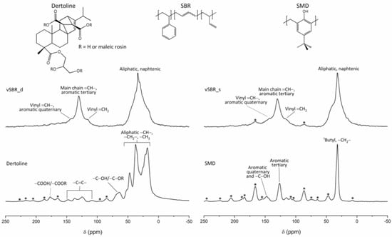 The 13C CP/MAS spectra of the pure SMD and Dertoline resins and of the vSBR_s and vSBR_d samples are shown in Figure 4, while those of Kristalex and vSBR_k are reported in a previous publication []. In the spectra of pure resins, the observed signals are those expected on the basis of the chemical structure. For instance, in the case of Dertoline, signals typical of an esterified rosin can be observed [,,]. Weak signals ascribable to resin carbons are also visible in the spectra of vSBR_d and vSBR_s, but a detailed analysis is prevented by the superimposition with the much more intense SBR peaks.